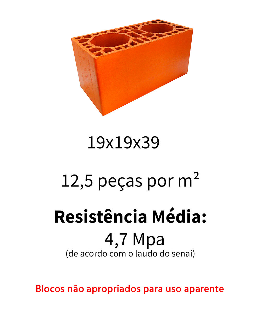 (11) 98192-2507O bloco cerâmico estrutural 19x19x39 é o bloco mais largo da linha estrutural. O bloco cerâmico estrutural 19x19x39 é utilizado para fazer as paredes externas dos pisos inferiores, onde necessita de colunas mais largas. O bloco cerâmico estrutural 19x19x39 é testado periodicamente no laboratório do SENAI e possuem a resistência mínima de 4 MPA de acordo com laudo. A linha do bloco cerâmico estrutural 19x19x39 é composta do bloco inteiro, do meio bloco, da canaleta cerâmica estrutural e do bloco seccionado.